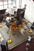 In the background is a full scale model of the Hubble Telescope |