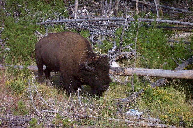 Our day started a bit later than planned due to some technical difficulties trying to publish our web updates. We finally gave up and decided we'd best get going as this was going to be an action-packed day of sightseeing. The first stop on our day was Mammoth Springs, which is located near the North entrance to Yellowstone National Park (YNP). Upon leaving Gardiner we followed the Gardner (not sure if this or Gardiner is an age old typo) River to Mammoth. Our exploration began on the lower loop of terraces which include the Minerva, Cleopatra, and Main Terraces. (See photos). After much exploring we decided to move on. Hopping back in the car we proceeded east on the Grand Loop Rd towards Roosevelt Lodge. Parking was packed as it was near lunch time, but we found a small space and squeezed our car in. The main lodge is primarily a dining hall with small lounge area and, of course, a gift shop. Adjacent to the lodge are some small individual cabins much like those which used to be near Yosemite Lodge. I like to call them studio cabins. Carefully squeezing out of our parking space we continued on the loop a short distance and stopped for a photo op at Tower Falls. After taking a couple of pictures we continued on to Upper and Lower falls, pausing only briefly for a bite to eat. The falls and the canyon are visible from a small stretch of road called the North Rim loop. This was a great place for taking pictures. So we did. Leaving the canyon we headed west across the middle of the figure eight loop and then south towards Old Faithful. Along the way we took time to stop and see some of the other hot springs and geysers at Fountain Paintpot. Shortly after leaving Fountain Paintpot traffic came to a screeching halt which can only mean one thing. As we navigated our way through double parked vehicles we saw the cause of the traffic jam, a bison "peacefully" grazing by the side of the road (see photo). Moving on we arrived at Old Faithful parking lot around 5:20pm and scurried over to join the assembling throngs to see Old Faithful shoot hundreds of gallons on hot water into the air. Our timing could not have been much better as we only had to wait about 10-15 minutes. After the show we head to Old Faithful Inn, one of several historic national park lodges. It was definitely worth the visit. The last leg of our trip took us to where we were to spend the night which was the Grant Village Lodge. Grant Village is on the south side of YNP and is adjacent to Yellowstone Lake. The elevation is about 8200ft. By the time we arrived at the lodge it was getting quite chilly so we bundled up and went out for a bite to eat. Finally we came back to our room ready for a well-deserved rest. At least our bodies were telling us that. Tomorrow is our final day in YNP, then we are off to Cody Wyoming. More tomorrow!!